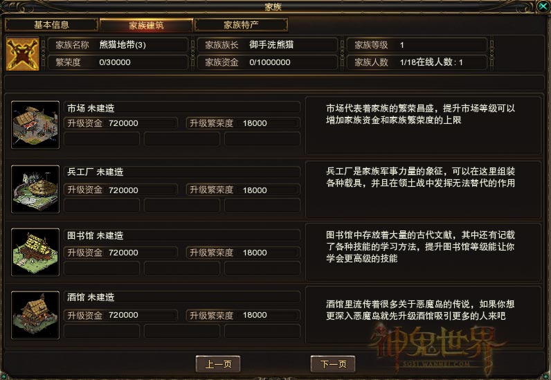 4)在公会界面里可以查看每个建筑升级下一级所需的材料和主要功能。